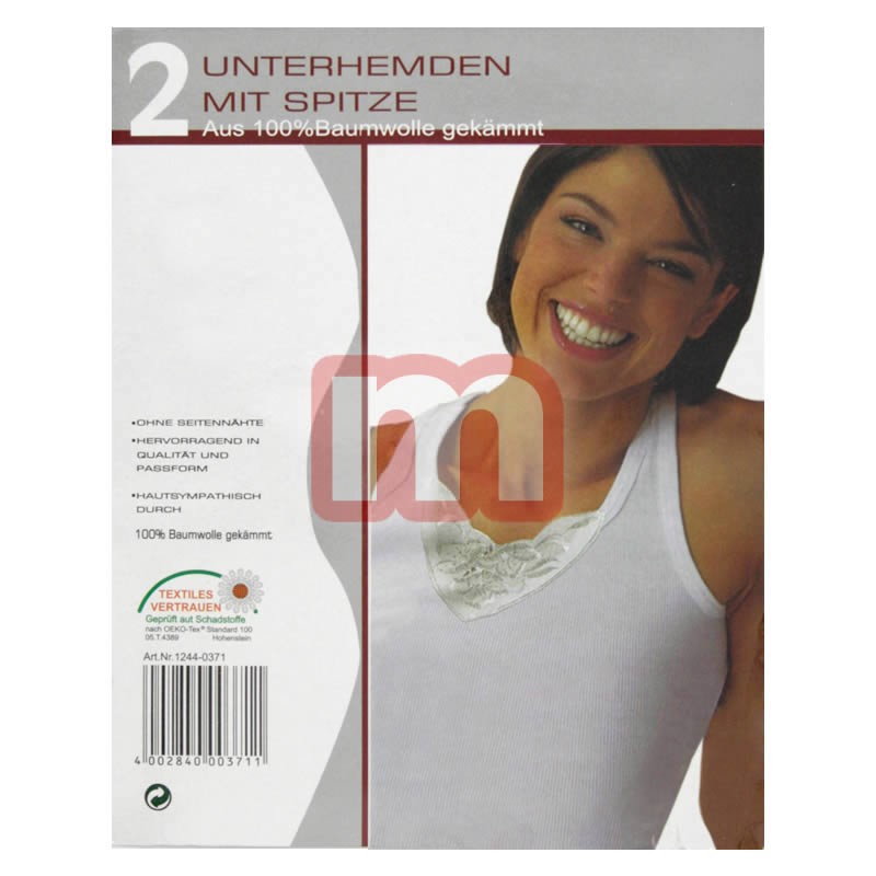 Sie erhalten bei diesem Angebot zeitlos modische Damen Unterhemden Unterwäsche mit Spitze, hergestellt aus 100% Baumwolle (gekämmt). Enthalten ist das abgebildete Modell, ohne Seitennähte, hervorragend in Qualität und Passform, hautsympathisch. Original verpackte Neuware. 1VE: 60 Stck. (verpackt zu je 2 Stck. pro Packung) Größen: 36/38 bis 52/54 (gemischt) Farbe: weiß Material: 100% Baumwolle Artikel-Nr.: 01_371 Preis je VE: 117,00 EUR Preis einzeln: 1,95 EUR