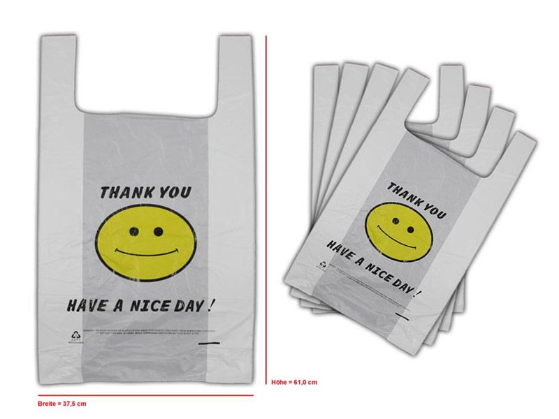 1.000 Tragetaschen Plastiktüten Hemdentaschen Tüten Weiß Smiley-Motiv - 37 x 61 cm (B x H) nur 0,045 EUR je Tragetasche Sie erhalten bei diesem Angebot 1.000 Tragetaschen mit dem abgebildeten Motiv. Die Tragetaschen werden gerollt geliefert - portioniert zu 100 Tragetaschen je Rolle. Neuware - original verpackt. 1VE: 1.000 Tragetaschen Maße: 37,0 x 61,0 x 16,0 cm (B x H x T) Muster bzw. Motiv: siehe Bilder Preis je VE (1.000 Tragetaschen): 45,- EUR Preis je Tragetasche: 0,045 EUR