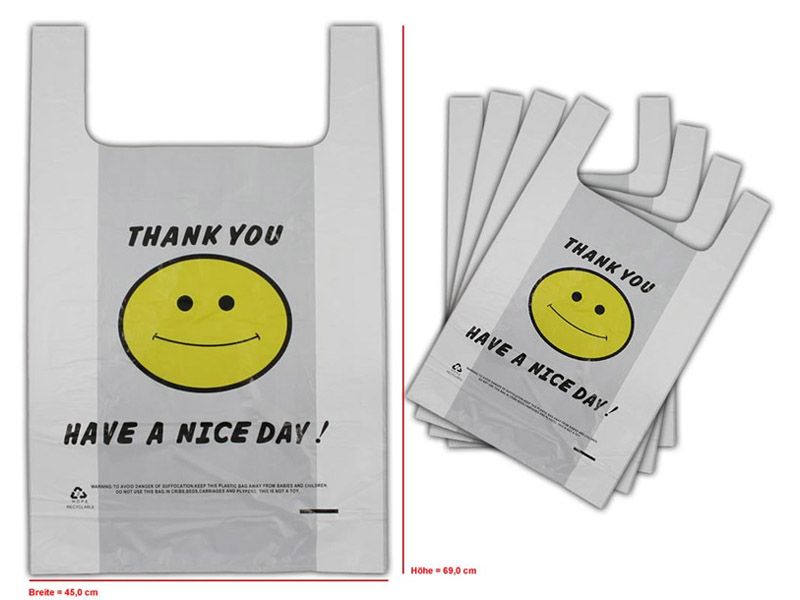 1.000 Tragetaschen Plastiktüten Hemdentaschen Tüten Weiß Smiley-Motiv - 45 x 69 cm (B x H) nur 0,055 EUR je Tragetasche Sie erhalten bei diesem Angebot 1.000 Tragetaschen mit dem abgebildeten Motiv. Die Tragetaschen werden gerollt geliefert - portioniert zu 100 Tragetaschen je Rolle. Neuware - original verpackt. 1VE: 1.000 Tragetaschen Maße: 45,0 x 69,0 x 17,0 cm (B x H x T) Muster bzw. Motiv: siehe Bilder Preis je VE (1.000 Tragetaschen): 55,- EUR Preis je Tragetasche: 0,055 EUR