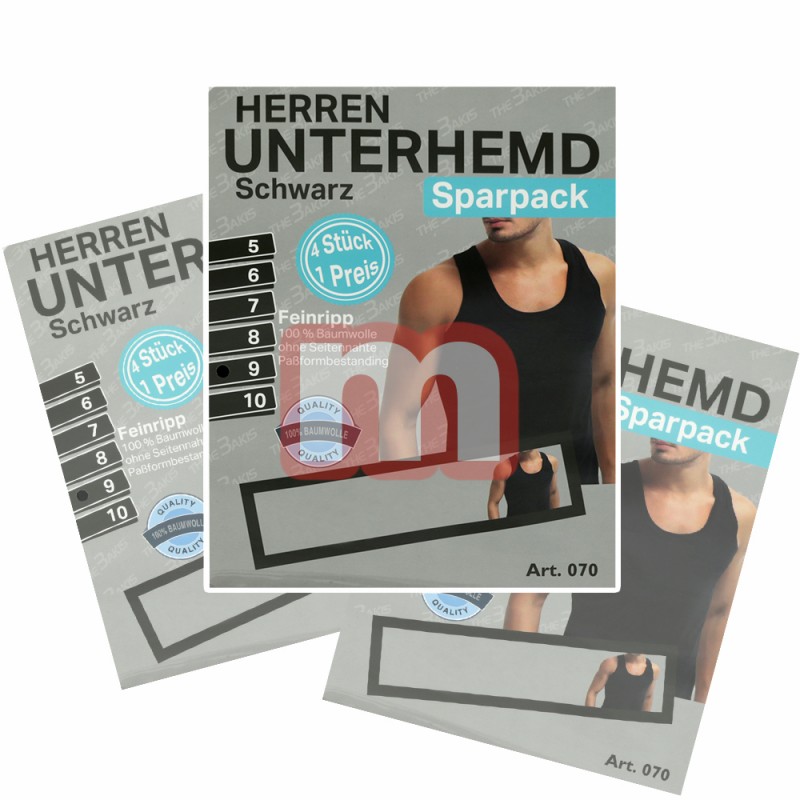 1VE: 80 Unterhemden (20 Pakete zu je 4 Stück) Größen: 5 bis 10 (gemischt) Farben: schwarz Materialien: 100% Baumwolle Artikel Nr: 02_070-black Preis je VE (80 Unterhemden): 127,20 EUR Preis je Unterhemd: 1,59 EUR