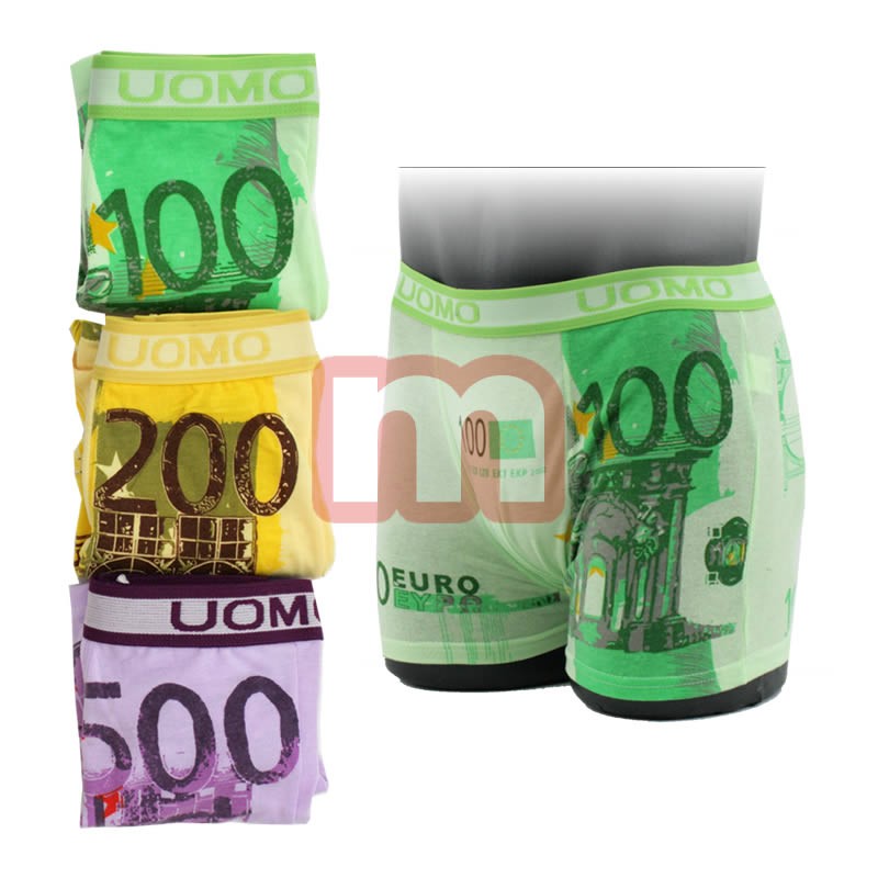 Mischposten von modischen Herren Unterhosen Boxer Shorts Slips mit den Motiven "100 Euro", "200 Euro" und "500 Euro". Das Bündchen mit eingearbeiteten Gummizug garantiert einen perfekten Sitz. Enthalten ist das abgebildete Modell, gemischt in verschiedenen Farben und Größen.