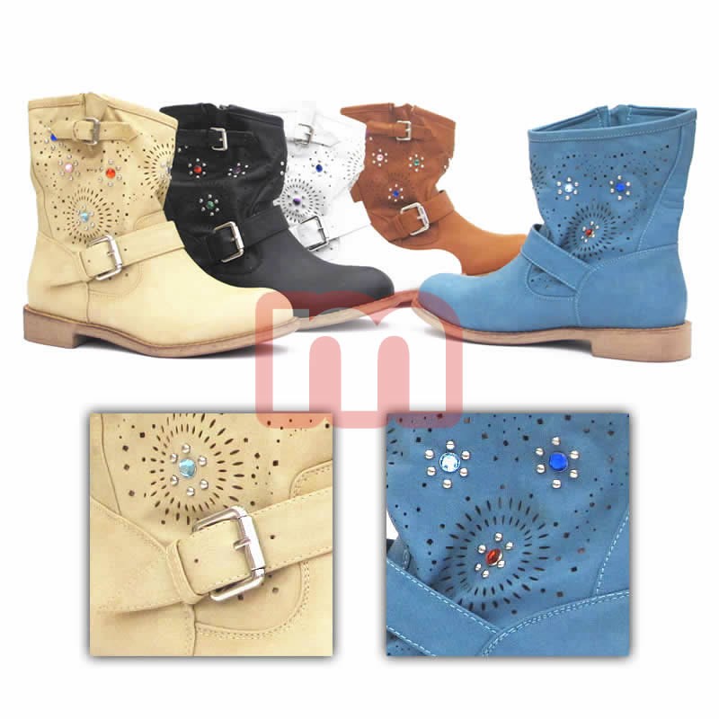 Modische Damen Boots Stiefel Schuhe in Lederoptik (Imitat), jeweils ausgestattet mit einer stabilen Sohle, Schnallen und Applikationen. Dieses Modell stammt aus der aktuellen Kollektion. Original verpackte Neuware. 1VE: 12 Paar Farben: Schwarz, Weiß, Beige, Blau und Camel (wählbar) Größe: 36-41 (gemischt) Artikel-Nr.: 01_ws8057 Preis je VE (12 Paar): 178,80 EUR Preis je Paar: 14,90 EUR