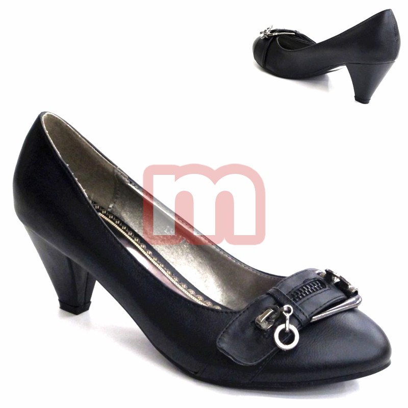 Modische Damen Pumps High Heels Schuhe in Lederoptik (Imitat), jeweils ausgestattet mit einem Absatz und Applikationen, gemischt in verschiedenen Größen. Die Farbe ist schwarz.