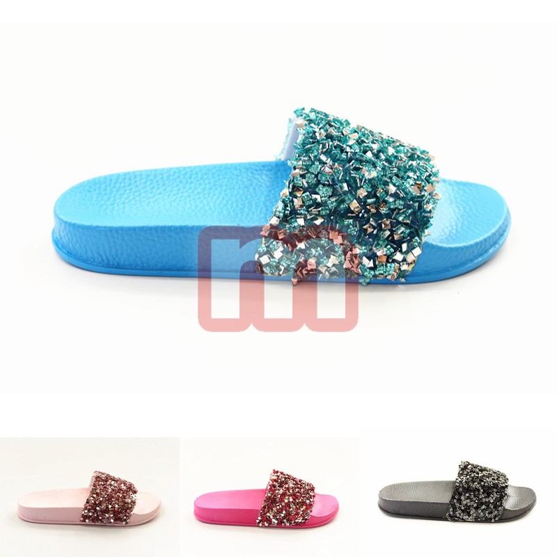Großer Mischposten mit modischen Damen Sommer Sandalen Slipper Bade Garten Strand Schuhe in aktuellen Farben, jeweils ausgestattet mit solider Sohle, gemischt in verschiedenen Größen.