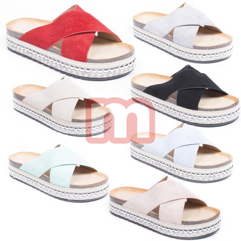 Großer Mischposten mit modischen Damen Sommer Sandalen Slipper Bade Garten Strand Schuhe in aktuellen Farben, jeweils ausgestattet mit solider Sohle, gemischt in verschiedenen Größen.