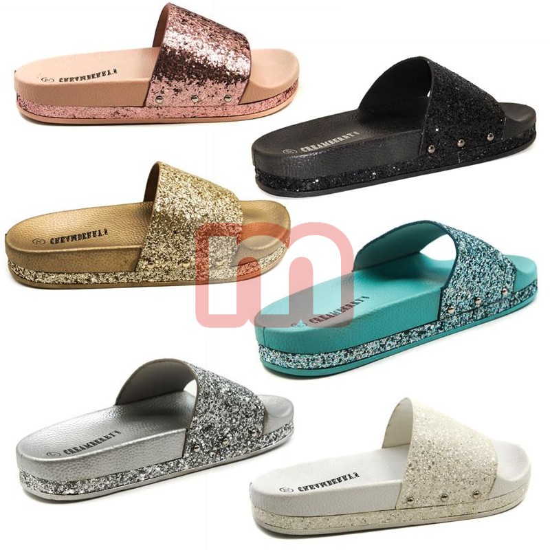 Großer Mischposten mit modischen Damen Sommer Sandalen Slipper Bade Garten Strand Schuhe in aktuellen Farben, jeweils ausgestattet mit solider Sohle, gemischt in verschiedenen Größen.