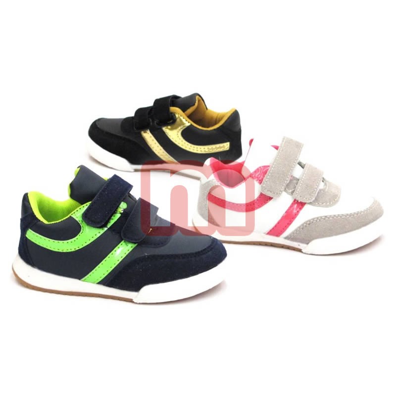 Trendige Kinder Mädchen Jungen Sport Freizeit Schuhe Sneaker, jeweils ausgestattet mit einer soliden Sohle und Klettverschluss. Enthalten ist das abgebildete Modell, gemischt in verschiedenen Farben. Die Größen können Sie selbst wählen. Dieses Modell stammt aus der aktuellen Kollektion. Original verpackte Neuware. 1VE: 24 Paar Farbe: schwarz, blau, weiß (gemischt) Größe: 25-30, 31-36 (wählbar) Artikel-Nr.: 03_ab-15 Preis je VE : 142,80 EUR Preis einzeln: 5,95 EUR