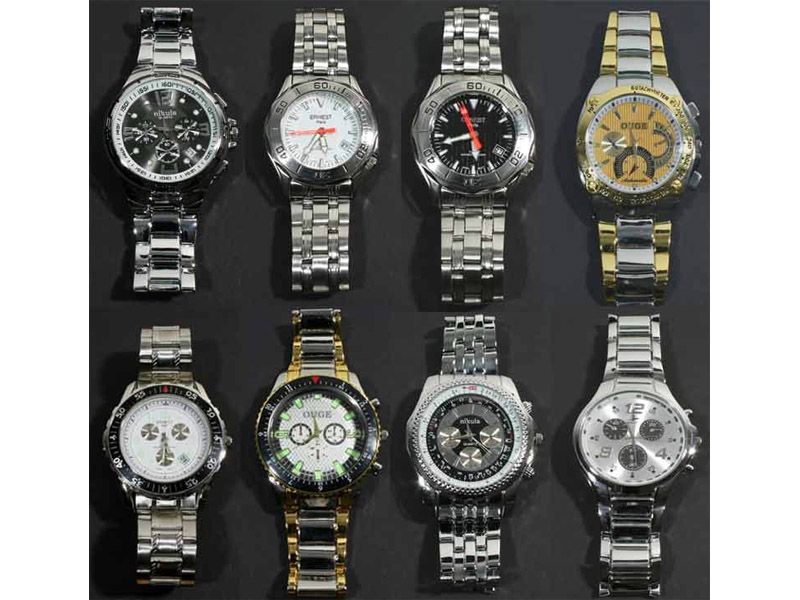 1VE: 20 Stück (gute Sortierung) Hersteller: Ouge, Ernest, Nikuls und Evros Farben: gold und silber (siehe Bilder) 100% Nickelfrei Die Uhren werden mit breiten Armband & Ziffernblatt geliefert. Einige Modelle sind mit Chronographen verarbeitet.